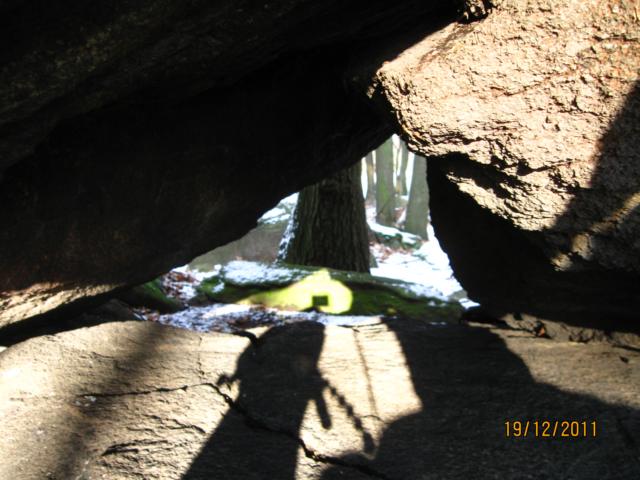 2 Tage vor der Wintersonnenwende scheint die Vormittagssonne unter dem Stein durch das Lichtfenster auf den Projektionsstein