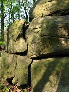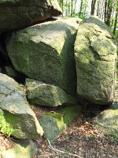 zu verkleinern. Bei den Bildern zeigt sich dies aus südöstlicher und aus nordwestlicher Betrachtungsrichtung. Der stehen gebliebene Steinteil ist etwa 18 cm höher aufragend als der Auflagestein. Selbst die zweite Auflage ist durch eine Absplitterung 'herunter gesetzt' worden, etwa 10 bis 15 cm. Mutmaßlich war in der Zeit der Errichtung dieser steinernen Beobachtungskonstruktion die Sicht zur Abendsonne am Horizont wesentlich besser.