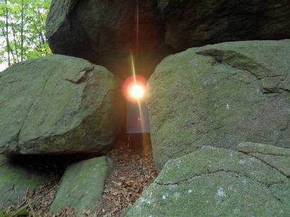 | Die Spalte zwischen beiden Steinen wurde sogar mit Steinstücken vor dem Zusammenklappen gesperrt. Der rechte Teil steht 18 cm höher hervor, also ist die rechte hintere Teilauflage des Steines 18 cm tiefer gelegt worden. Durch was eigentlich ? | Die an der zweiten Steinpartie vorhandenen Kanten lassen Deckungsgleichheit erkennen, oder zumindest Merkmale hierzu. Der darunter befindliche Auflagestein scheint einer gewaltigen Erschütterung auch nicht widerstanden zu haben. | Das "Feuerwerk" der untergehenden Sonne könnte vor Jahrtausenden wesentlich brillanter zu betrachten gewesen sein, falls die Sichtöffnung größer war. Bei diesem Foto wiederum ein Gazetuch zur Kontrolle des Lichtdurchtritts und Einfallwinkels. |