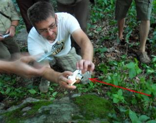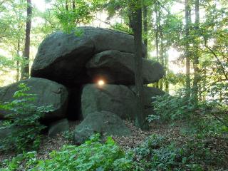 Dieses Video und das Bild daneben zeigen das durchtretende Licht auf der Hand des fotografierenden Besuchers an der "Steinernen Himmelsscheibe" am 22. Juni 2012 gegen 20.25 Uhr und das Sonnenlicht "durch den Stein" bei leichter Positionsänderung der Kamera. Der Pfeil weist auf das einfallende Licht auf Hand und Digitalkamera.